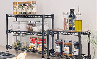 調味料などの小物類や、食器、キッチン用品でごちゃつきがちなキッチン周りをスチールラックや収納アイテムを使って整理整頓。